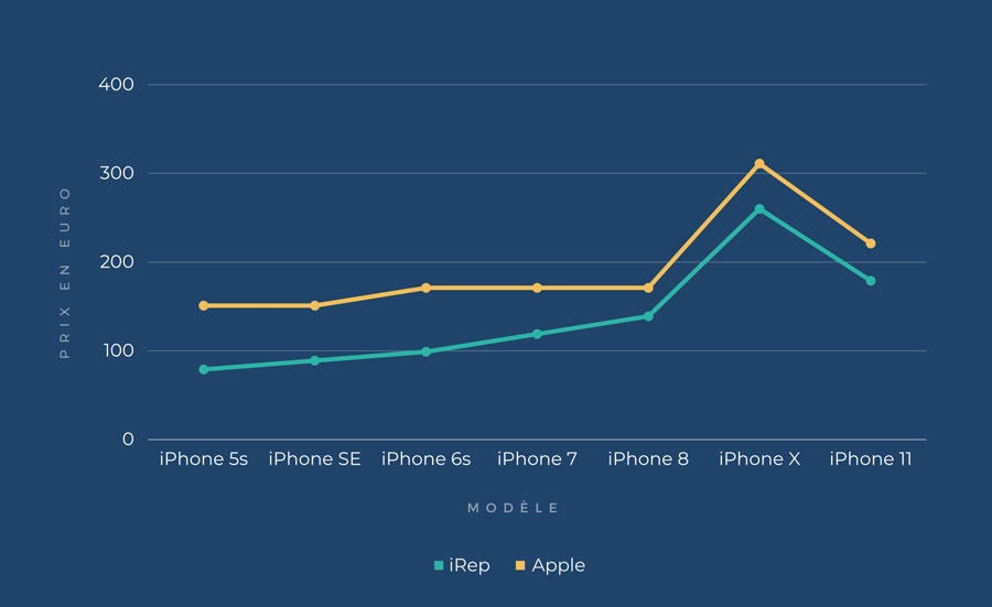 En moyenne, une réparation d'écran d'iPhone coûte 176€ chez iRep. Le prix de remplacement d'une batterie d'iPhone est de 53€ en moyenne.